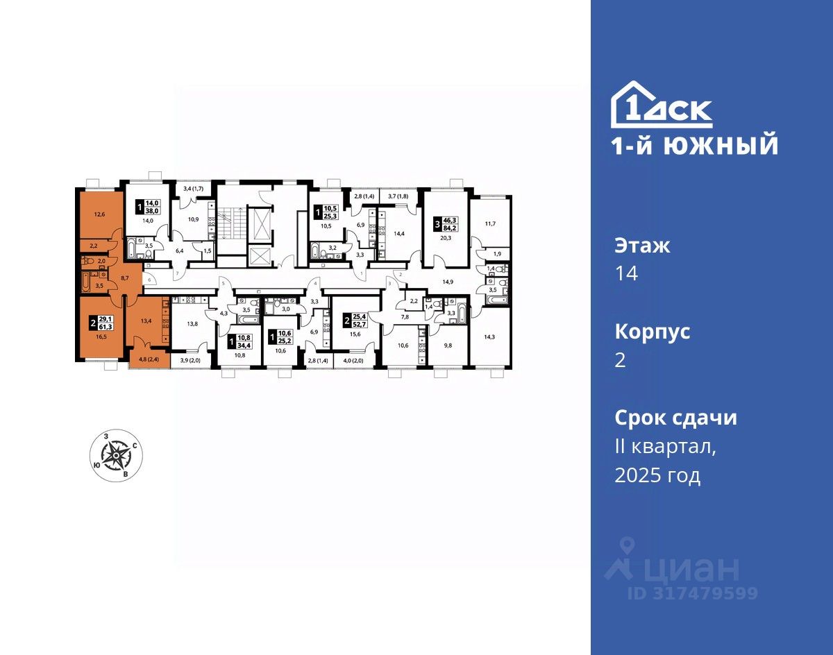 Максимальные скидки при 100% оплате. Trade-in вместо первоначального взноса - выгодно обменяйте вашу квартиру на новую! Корпус сдан! Прямая продажа от застройщика! Жилой Комплекс класса Комфорт плюс. Продаётся 2-к квартира номер 416 в сданном корпусе общей площадью 61.3 кв.м на 14-м этаже 25 этажного дома.