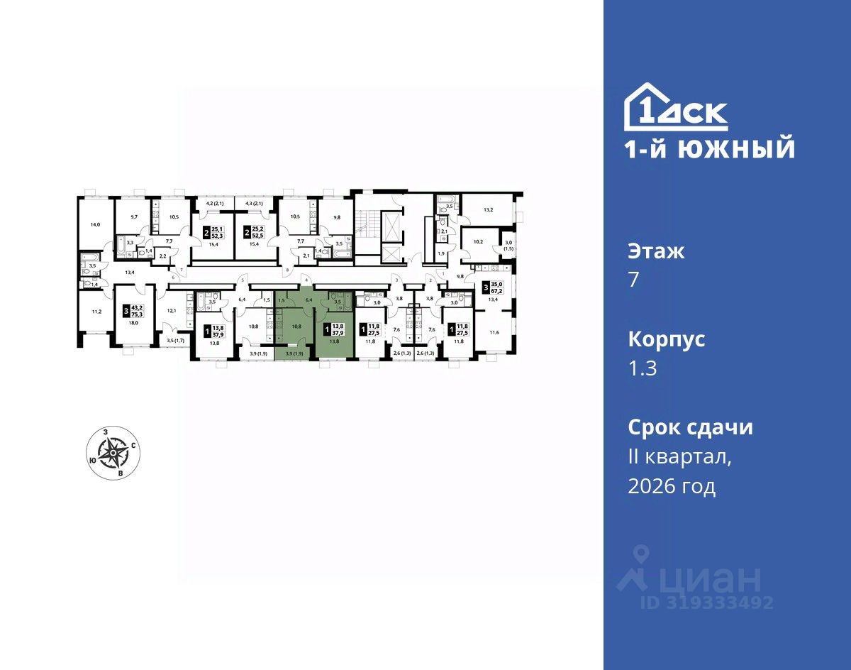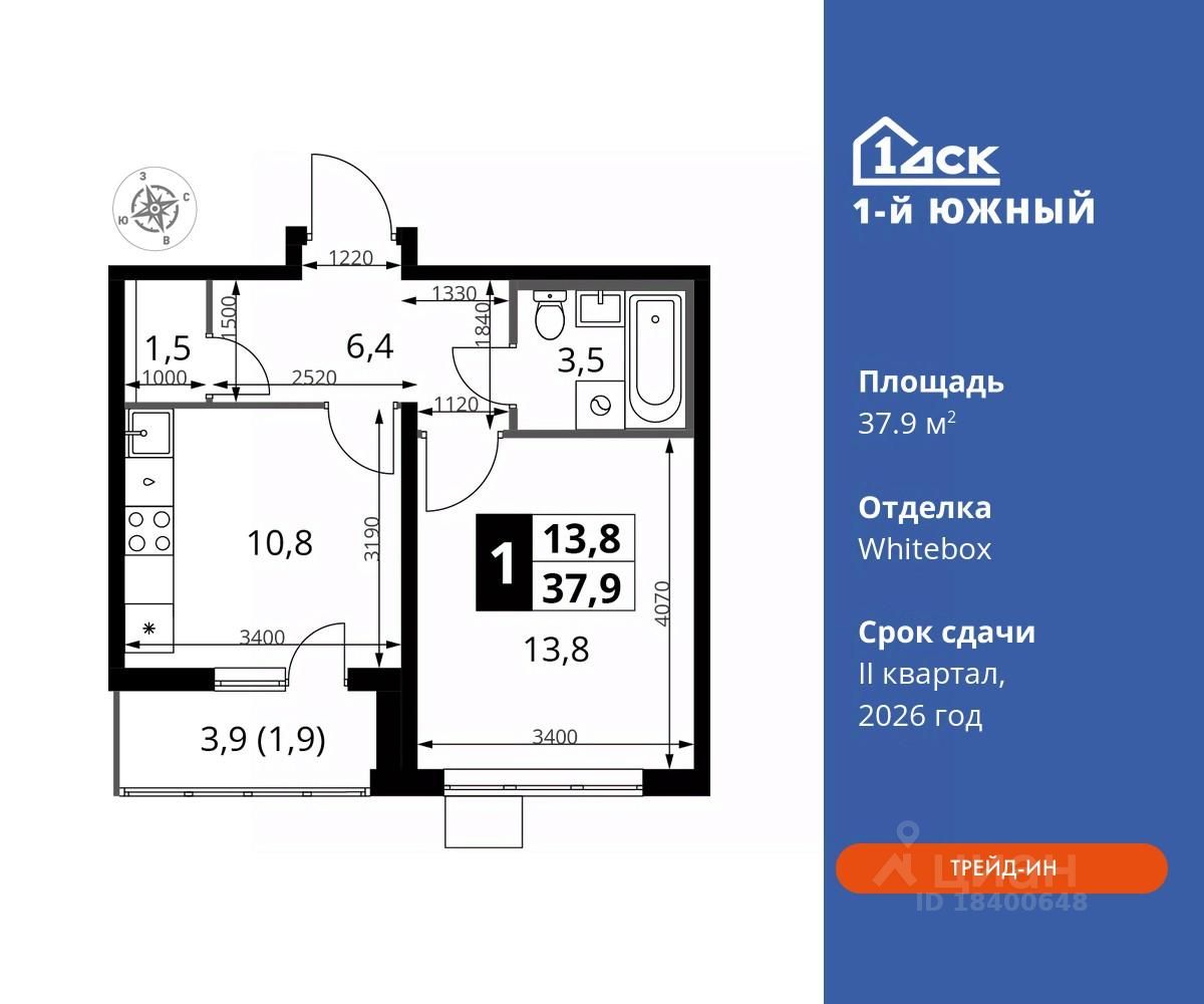 продам 1-к, Первый Южный ЖК, 1.38 353 710 ₽
