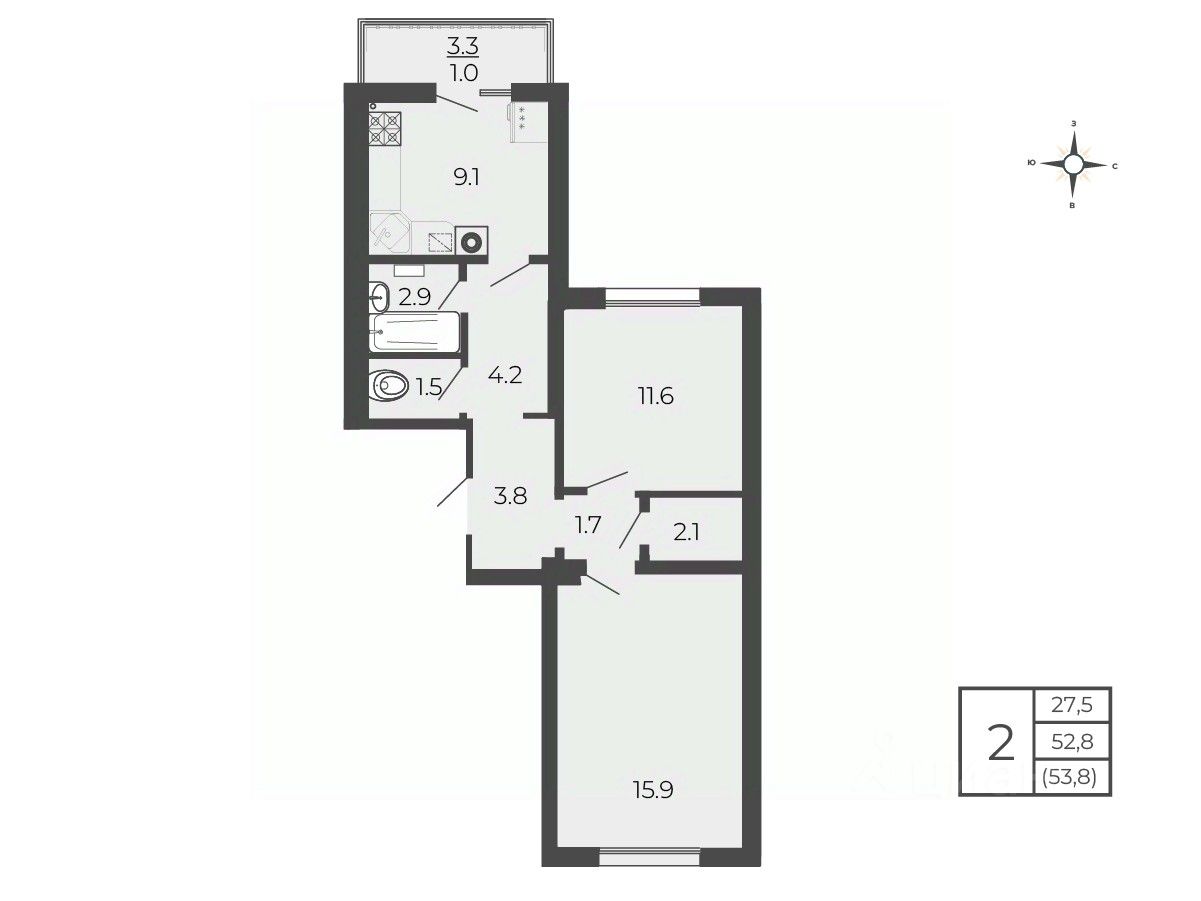 Общая площадь53,8 м2