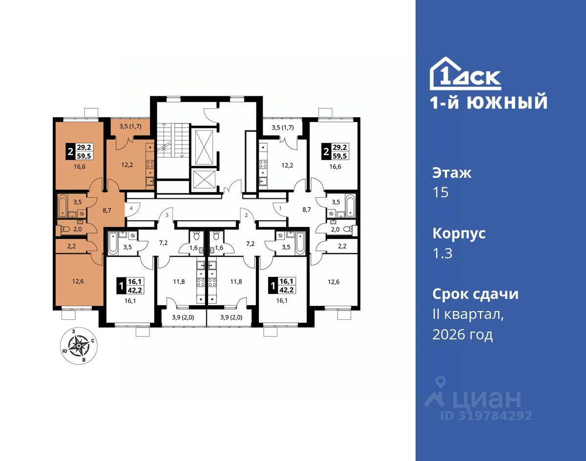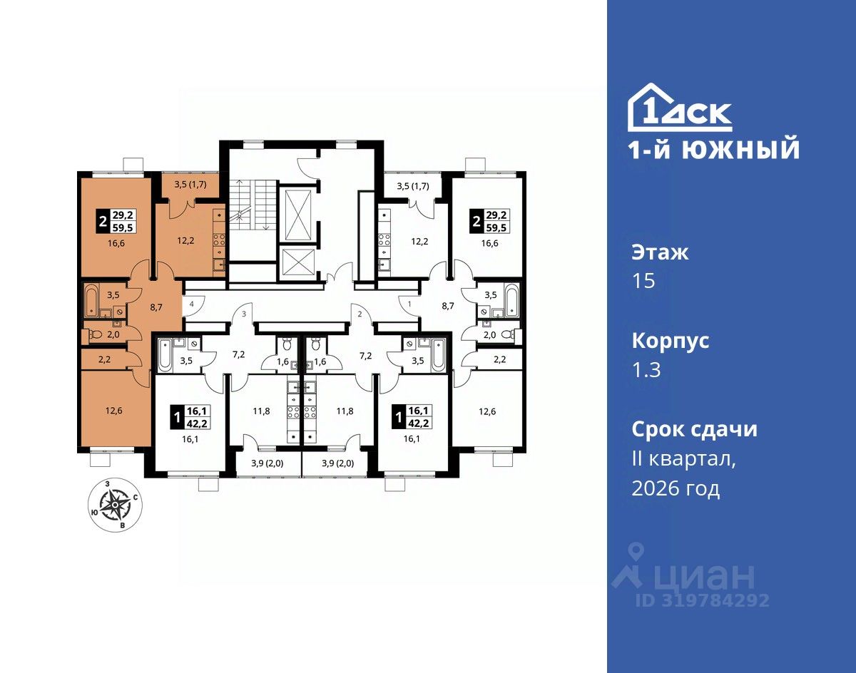 продам 2-к, Первый Южный ЖК, 1.312 568 304 ₽