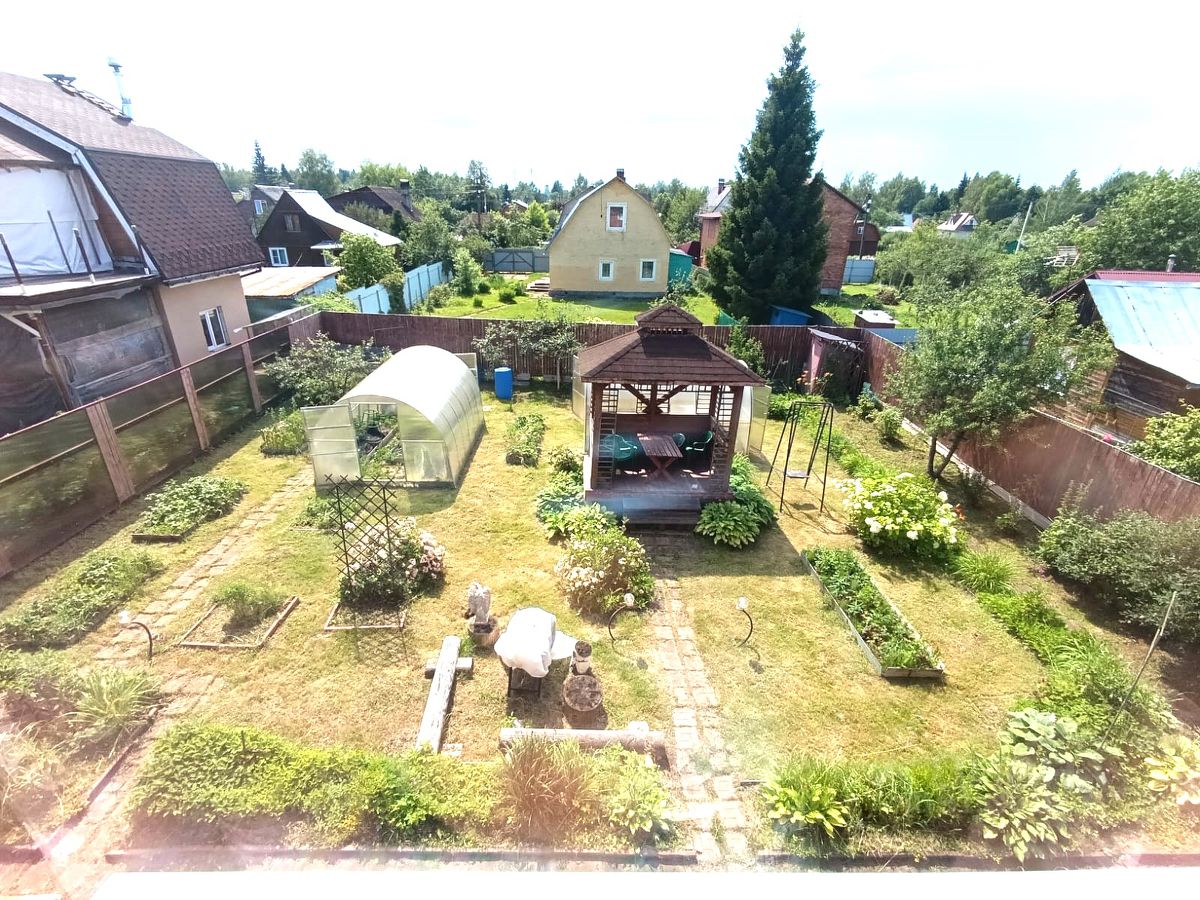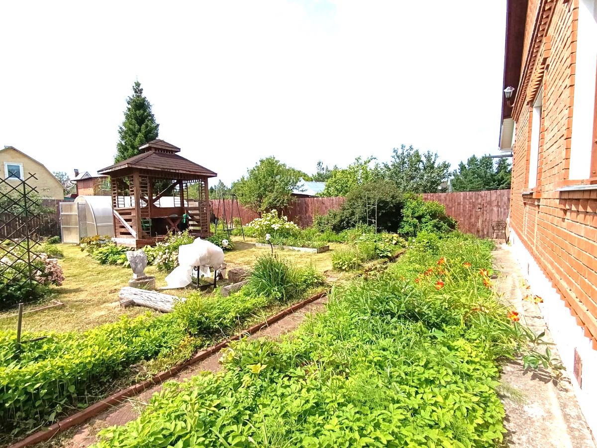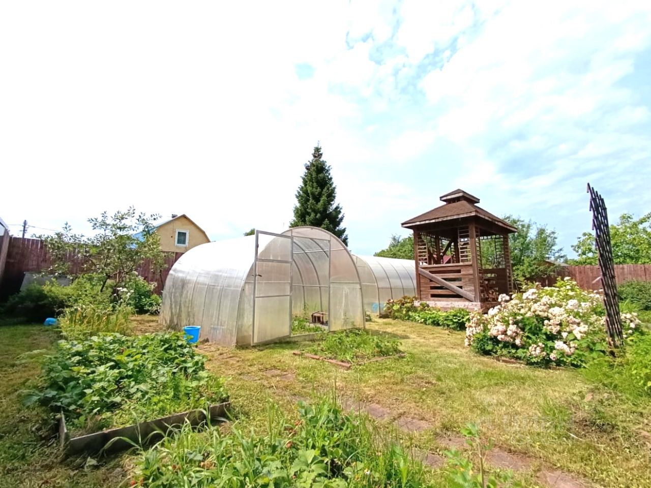 На ухоженном участке располагаются две теплицы и беседка. Также есть грядки и садово-плодовые растения.