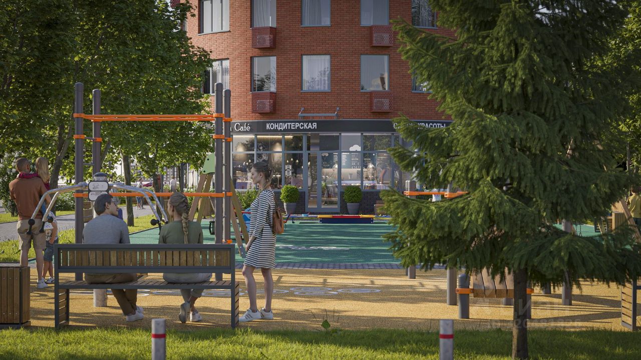 На территории комплекса вас ждут: зеленый двор, зоны отдыха, детские площадки и полностью пешеходная среда. На первых этажах домов предусмотрены магазины, кафе и предприятия бытового сервиса.