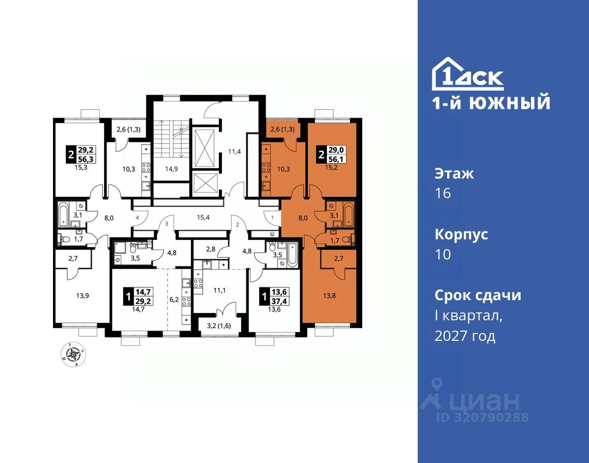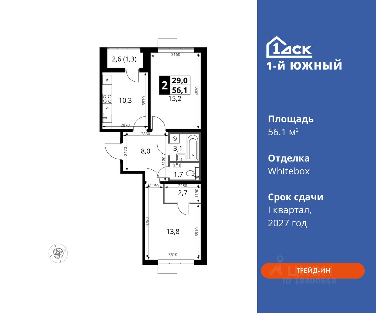 Максимальные скидки при 100% оплате. Trade-in вместо первоначального взноса - выгодно обменяйте вашу квартиру на новую! Прямая продажа от застройщика! Жилой Комплекс класса Комфорт плюс. Продаётся 2-к квартира номер 494 общей площадью 56.1 кв.м на 16-м этаже 24 этажного дома. Отделка Whitebox.