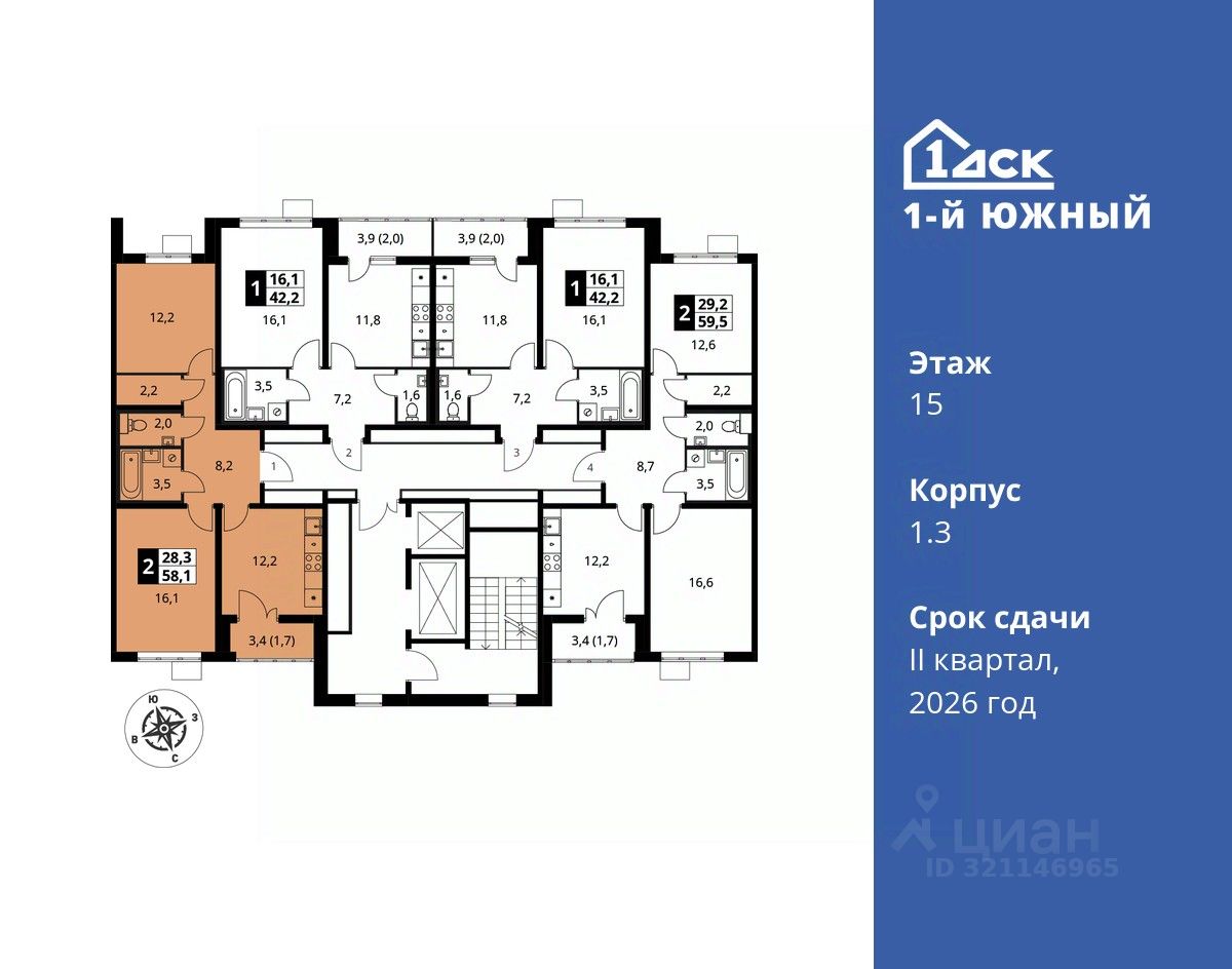 продам 2-к, Первый Южный ЖК, 1.313 624 450 ₽