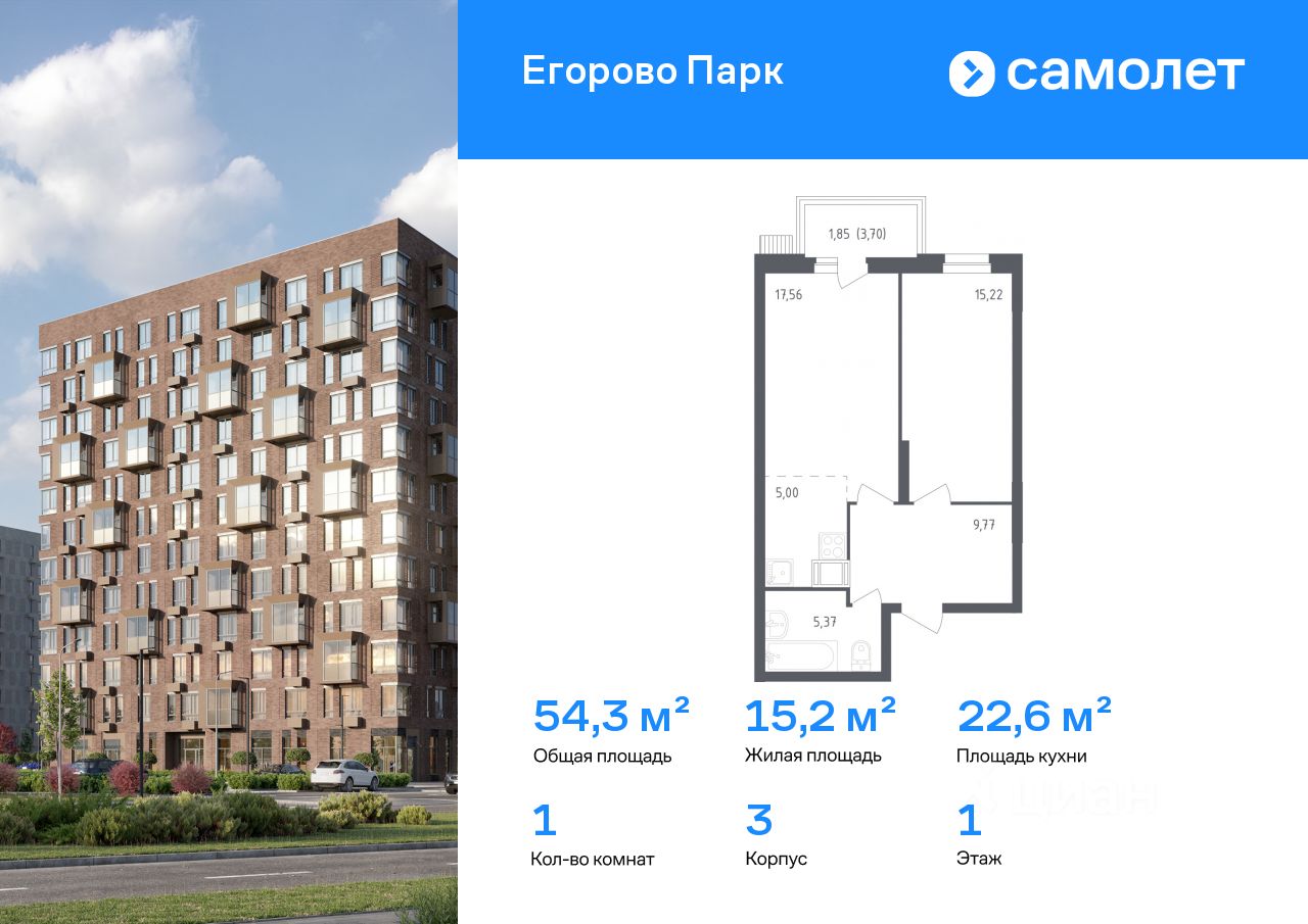 Строим кварталы для жизни с заботой о будущем. Предлагается 1-комнатная квартира комфорт-класса 54,3 кв.м в корпусе 3 на 1 этаже, в ЖК ''Егорово Парк''